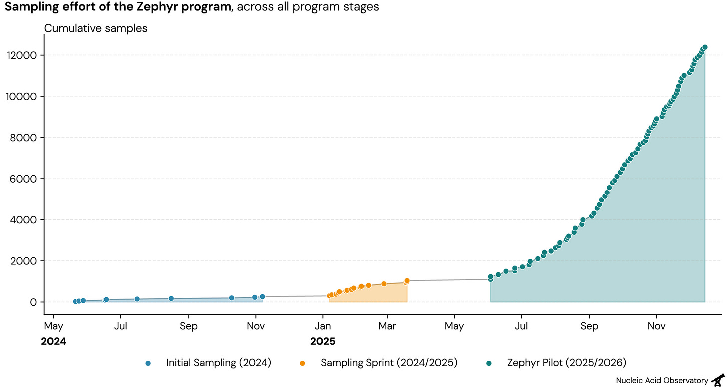 Zephyr has collected more than 10,000 individual samples over the last six months—an order of magnitude more than all samples we previously collected. This effort is supported by a team of field samplers and an expanded wet lab, who together enable us to sample and process 500–1,000 swabs a week.