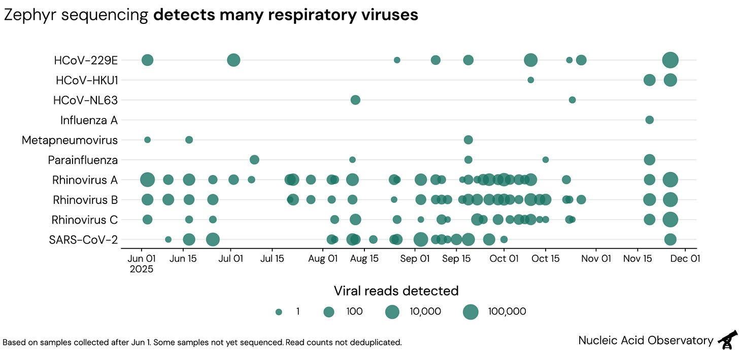 Zephyr is already helping us monitor for concerning known pathogens. Once we’ve collected data through the full 2025/2026 winter season, we plan to publish a detailed analysis of Zephyr’s performance and cost-effectiveness. In the meantime, if you’re interested in partnering on the Zephyr program or have questions about our data, we’d love to hear from you at nao-inquiries@securebio.org.
