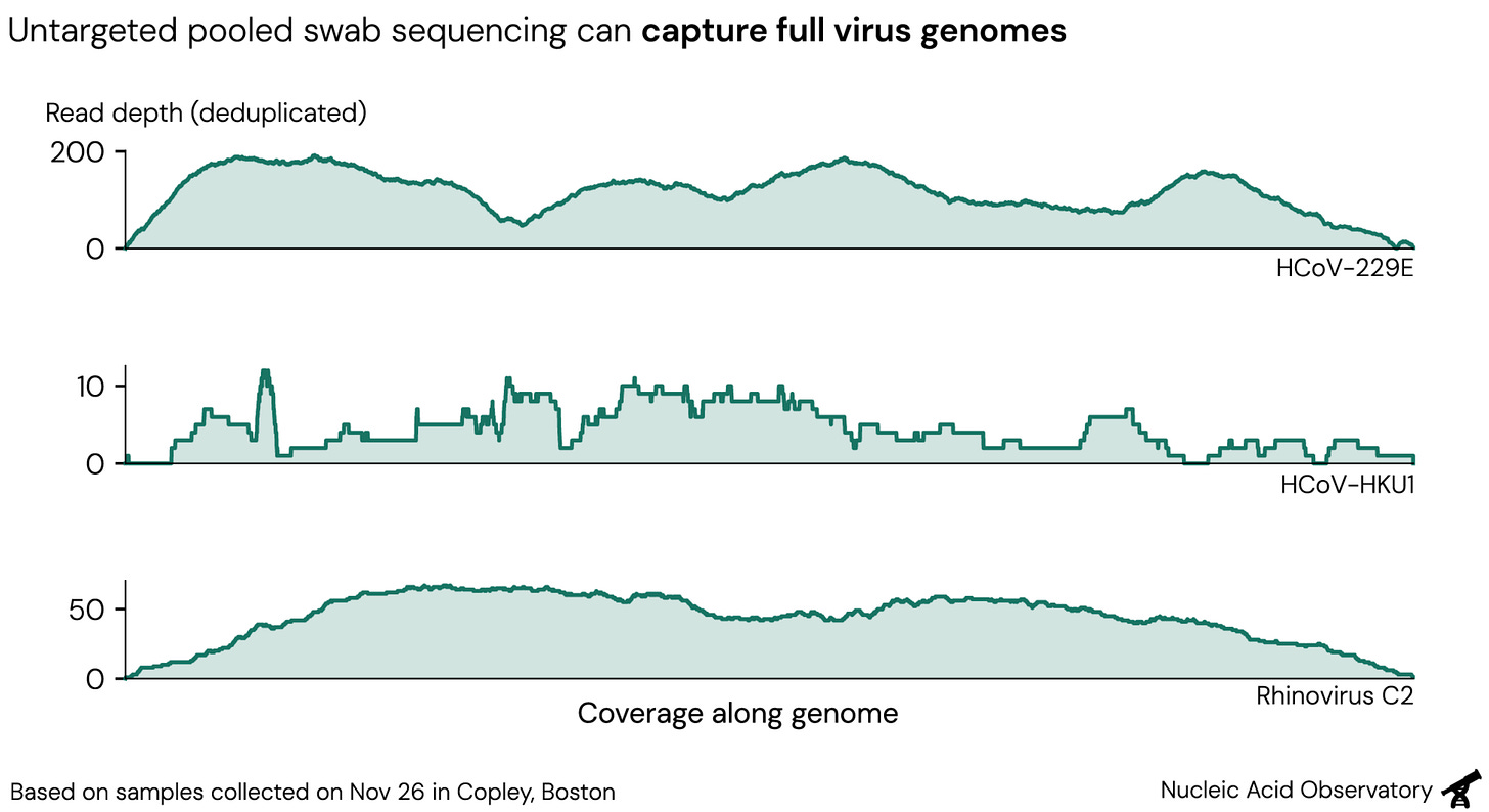 This is why we created Zephyr, a new detection system based on large-scale nasal swab sampling and metagenomic sequencing. Over the past six months, the Zephyr program has collected more than 10,000 nasal swabs in Boston and detected a broad range of respiratory viruses without targeted enrichment. While Zephyr is still a pilot program, we monitor our data for reportable pathogens and would notify the Massachusetts Department of Public Health of any concerning discovery.
