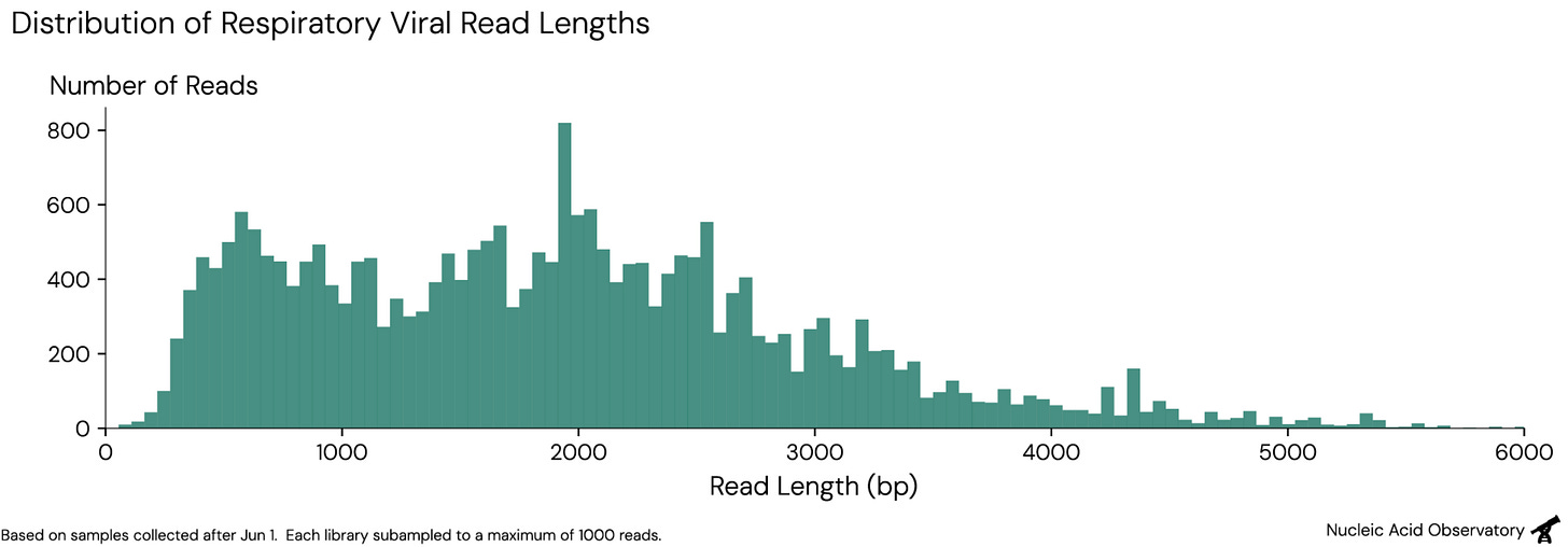 The data we make public is created through Oxford Nanopore sequencing, which generates relatively long reads: For respiratory viruses, we get a median read length2 of 1,857bp (5th% = 436bp, 95th% = 3,900), which can cover a substantial section of a typical respiratory virus genome (~7,000–30,000 bp).